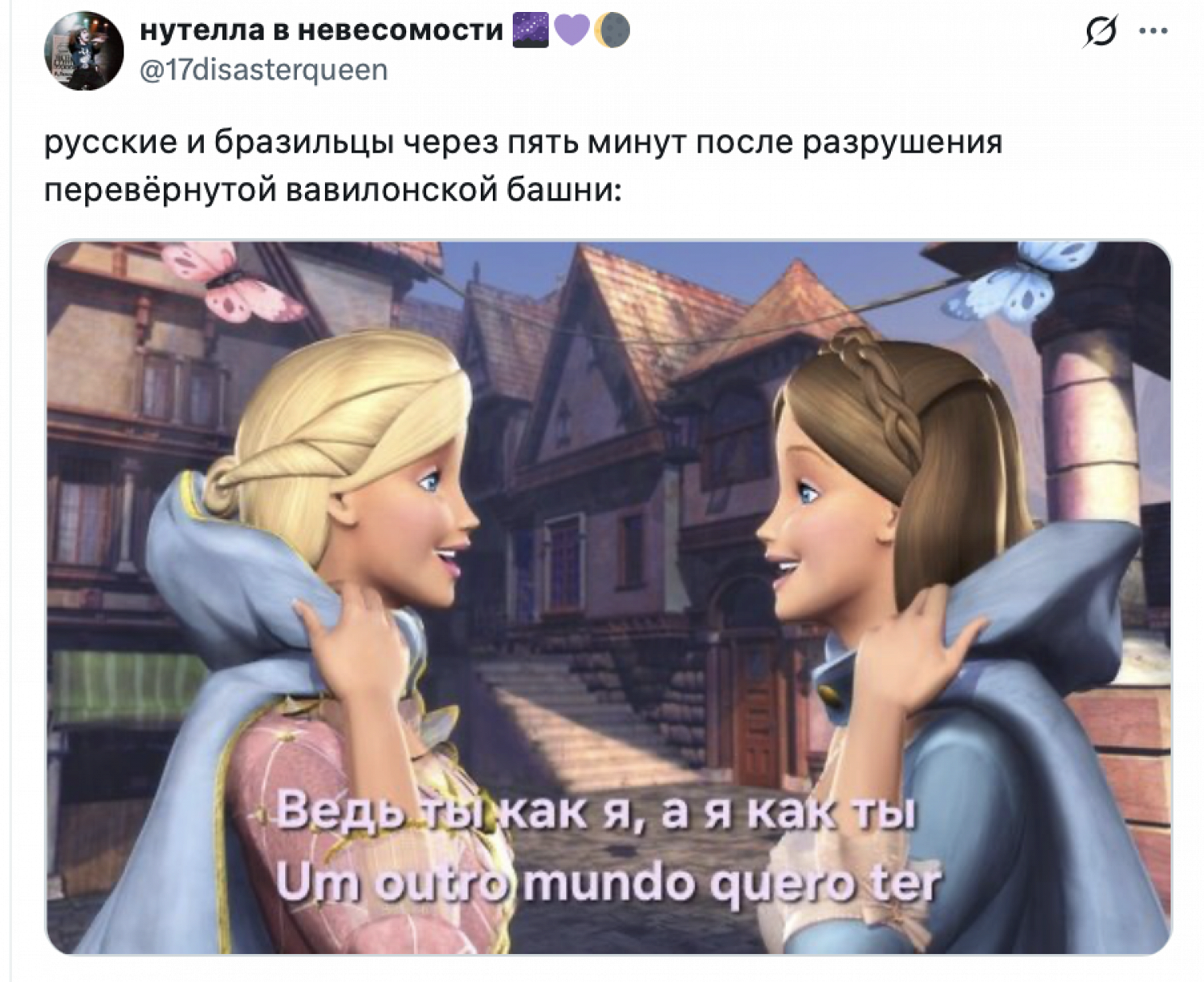 Наибольшее сходство обнаружили российские и бразильские пользователи. Обсуждение началось с мемов о настойках на кроте и аналогах на крабе и змее. Выяснилось, что бразильцы также любят орешки со сгущенкой и имеют свою версию тюремной загадки про два стула, где вместо пик предлагается сесть на торт или съесть его.