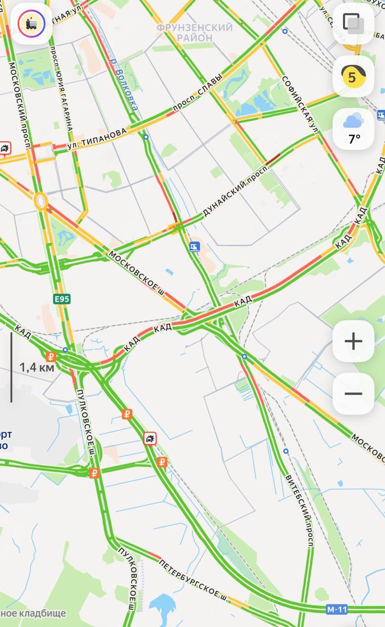 Сервис «Яндекс. Карты» показывает пятикилометровый затор на внутреннем кольце КАД между Рябовским и Колтушским шоссе. Сильные пробки также парализовали подходы к мосту Александра Невского: загруженными остаются Малоохтинская набережная, проспект Косыгина и прилегающие улицы. На этих участках также ведутся дорожные работы.