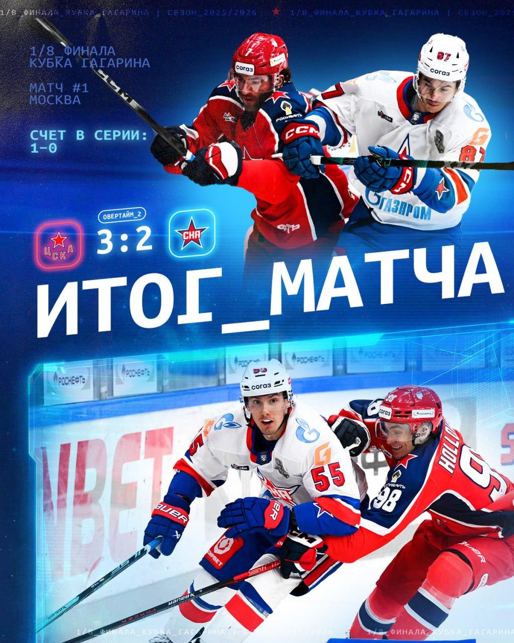 В первом матче серии 1/8 финала Кубка Гагарина ЦСКА одержал победу над СКА со счётом 3:2, переиграв соперника во втором овертайме.